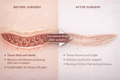 Why it failed: Every one of those products sits on the surface. But after surgery, the problem isn't on the surface. The mucous membranes that line your tissue thinned out and stopped producing their own moisture. No cream can fix tissue that's too thin to hold moisture. It's like pouring water on concrete. It slides off. That's why Replens clumped. That's why the lubricant lasted an hour. That's why you had to reapply before it even mattered.