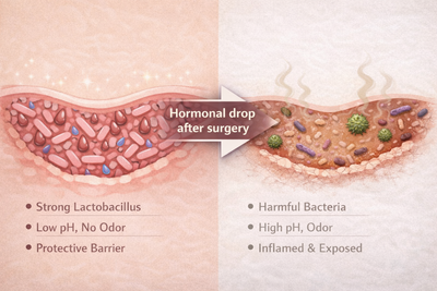 Yes, and honestly this is who we built it for first. When the ovaries are removed, the estrogen drop is immediate and severe, which means the bacterial collapse and tissue dryness hit harder and faster than natural menopause. The four Lactobacillus strains and Slippery Elm in this formula are specifically chosen to address that level of disruption, not just the mild shift that comes with aging.